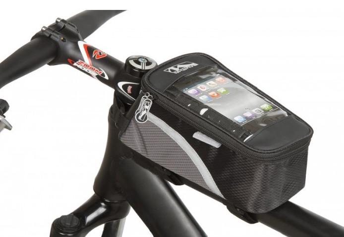 Велосумка на раму M-Wave Rotterdam Top L, для установки на верхнюю трубу велосипеда, для смартфонов, mp3 плееров, навигаторов с экранами до 5 дюймов, пленка поддерживает работу сенсорных экранов, крепление тремя ремешками, материал Oxford 600D Nylon, размер 17.5x8.5x9/6.5 см, объем 0,5 литра.