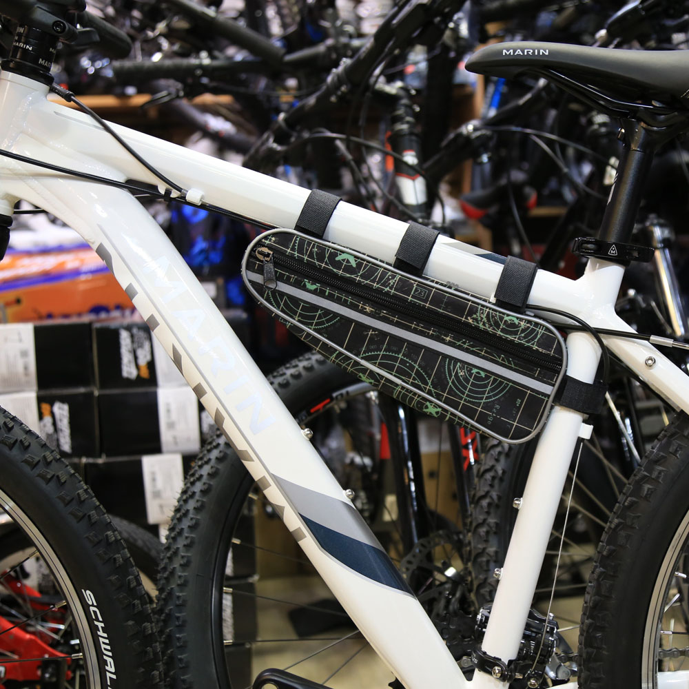 Узкая длинная подрамная велосумка для полезных вещей, инструментов, карт, насоса, запасных деталей и т.п.2 отделения - молнии с двух сторон.