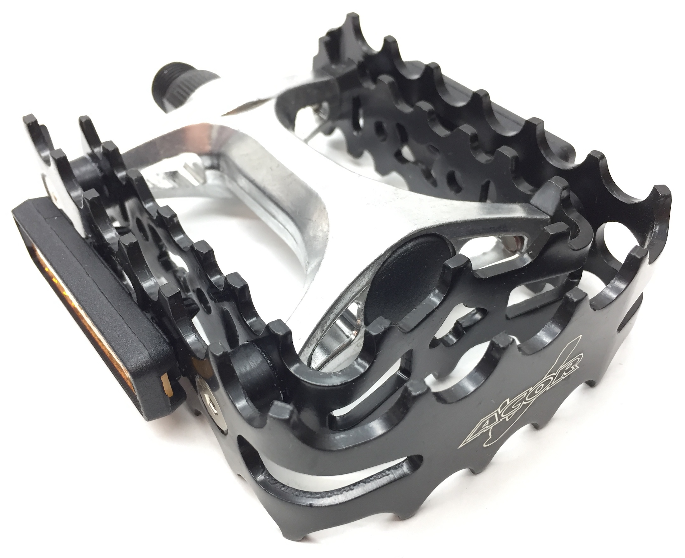 Велосипедные педали Acor TRIAL Double Alloy Caged, двойные рамки, размер платформы 83х110х40 мм, материал: платформа из алюминия, рамки сталь, ось Cr-mo; с катафотами, картриджные подшипники, вес 480 грамм (пара).