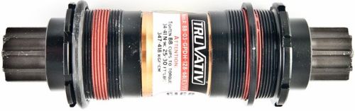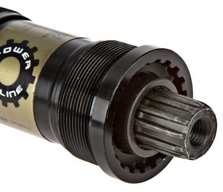 Стандарт Power Spline – выдумка от Truvativ, и далеко не самая удачная. Размеры каретки 68/73х113 или 68/73х118. Кострукция та же что и у квадратных кареток, только вместо квадрата 12 мелких прямоугольных параллельных шлицов. Шатун запрессовывался на шлицы за счёт слегка конической формы оси. Визуально определить стоит ли такая каретка у Вас или нет можно по знаку который виден ниже на фото по центру корпуса каретки. Такой знак наносят на правый шатун с внешней стороны.Размер резьбы в оси М8х1