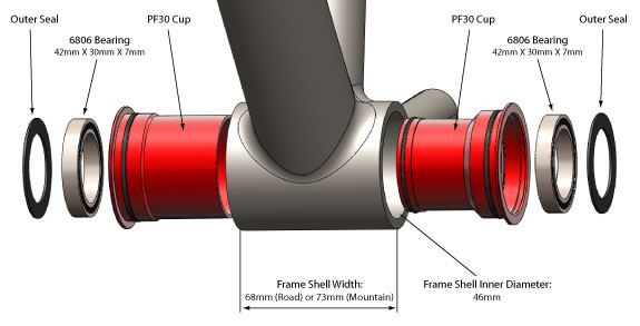Это относительно новый стандарт кареток на МТВ и шоссе. Наиболее популярен на шоссейных рамах, но в последнее время стал появляться и на МТБ. Узел рамы увеличился в диаметре с 42 мм до 46 за счёт чашек. Теперь подшипник в чашках при запрессовке упираются в торец рамы. К стати подшипник тот же что и в ВВ30.
