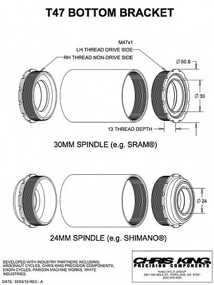 Формат каретки разработан компаниями Chris King и Argonaut Cycles в 2015 году. По сути это рама ПрессФит 46 мм. с нарезанной в ней резьбой. Большой "плюс" в том, что не будет скрипа в соединении рама/каретка как у BB30 и PrissFit. Теперь в карбоновой раме нужна металлическая вставка под резьбу, что слегка увеличит габариты. Для установки/замены такой каретки теперь нужно меньше навыков и попроще инструмент, чем для ПрессФитов...