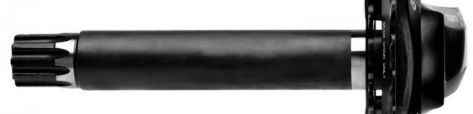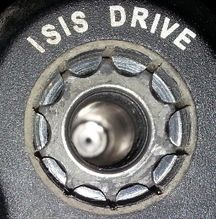 Каретки Truvativ JIS и ISIS имеют стальной или алюминиевый спейсер 2.5 мм. По сути каретка 73 мм., и если ставить её на раму 68 мм., то он, спейсер, компенсирует лишнюю длину. Если у каретки JIS левая чашка сквозная, то у ISIS глухая как на фото выше. Резиновое кольцо закрывает щель между буртиком чашки и рамой и выполняет декоративную функцию. У кареток стандарта ISIS на концах оси имеется 10 клиновидных шлицов образованных выборкой оси полукруглым углублением. Посадка шатуна на ось не имеет касания ни на ребре шлица, ни во впадине между шлицов. Так как шлиц клиновидной формы шатун напрессовывается на верхнюю половину шлица по бокам