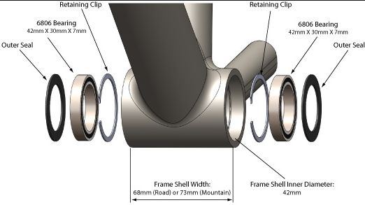 Это первый формат оси в 30 мм. Узел рамы имеет размеры в диаметре 42 мм и длиной 68мм шоссе и 73 мм. МТВ. Запрессовка подшипников происходит напрямую в раму и упирается в ограничители в виде стопорных колец установленных в пазы.