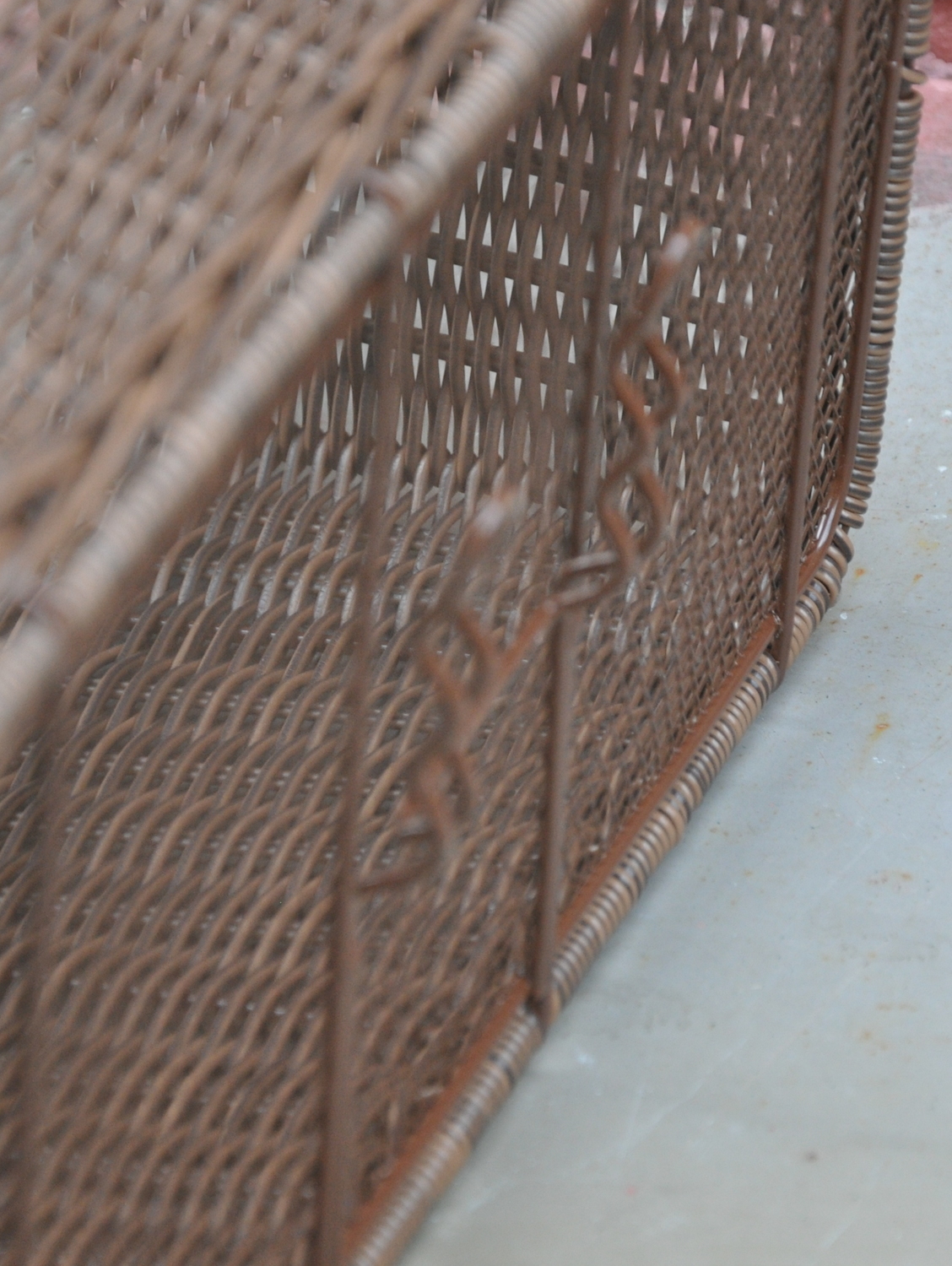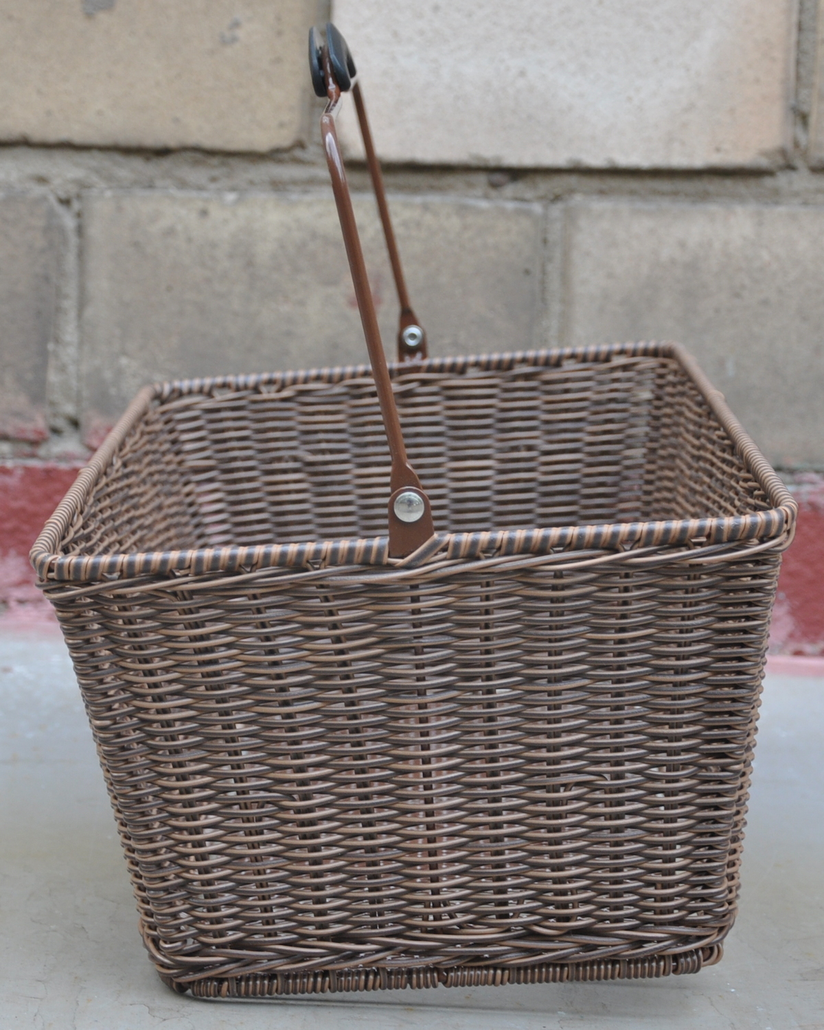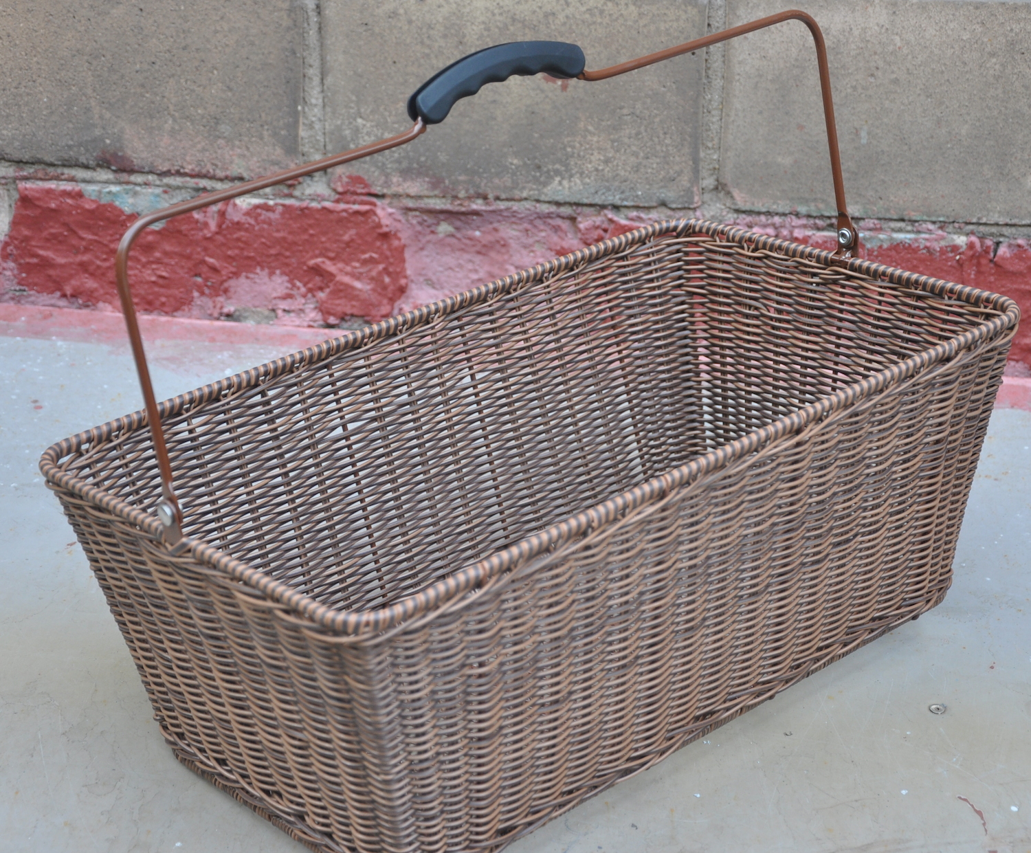 Корзина задняя для установки на багажник под прижимное устройство, плетеная из композитного ротанга с обрезиненной ручкой, цвет коричневый, размер 45x26x17 см.