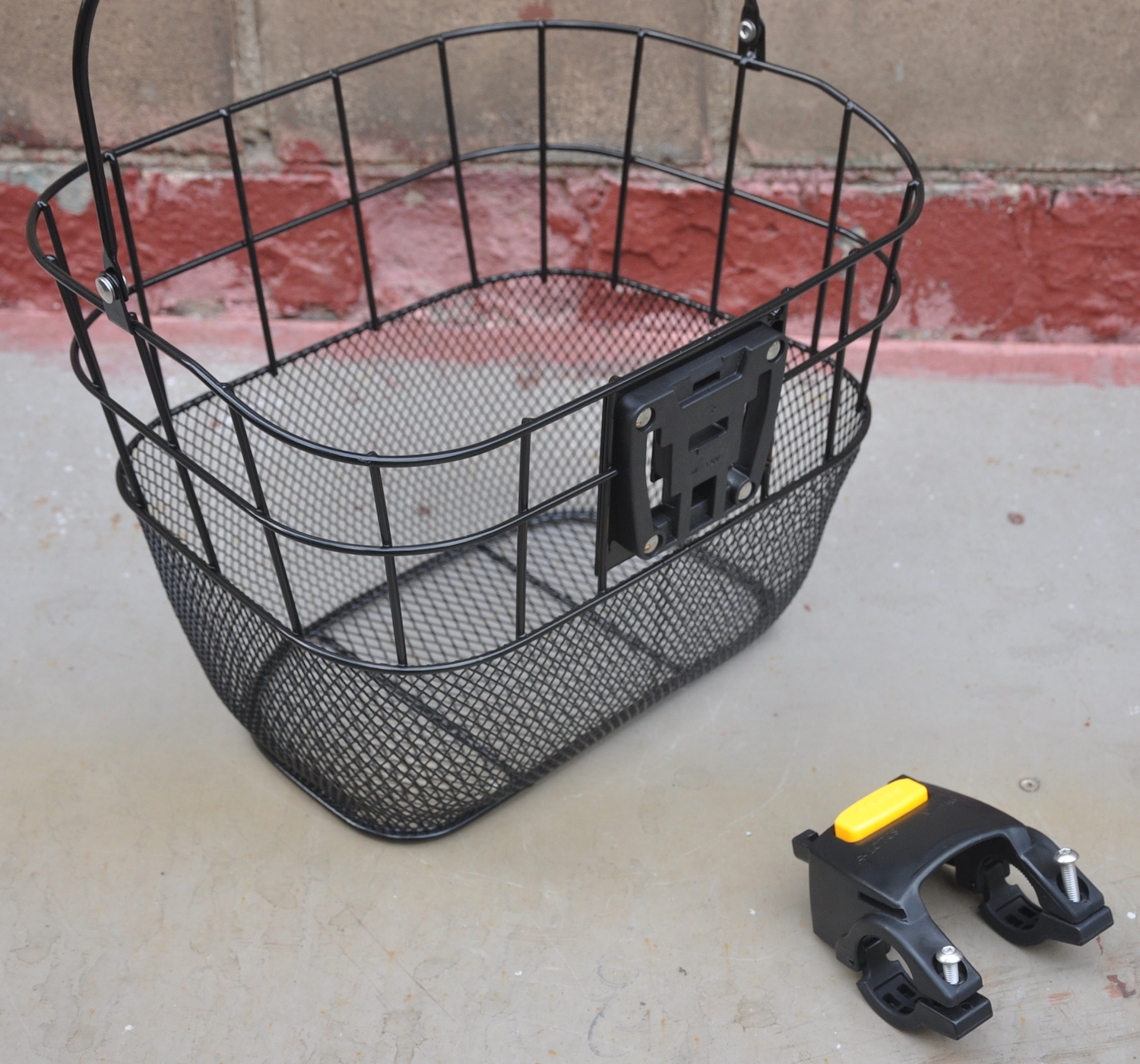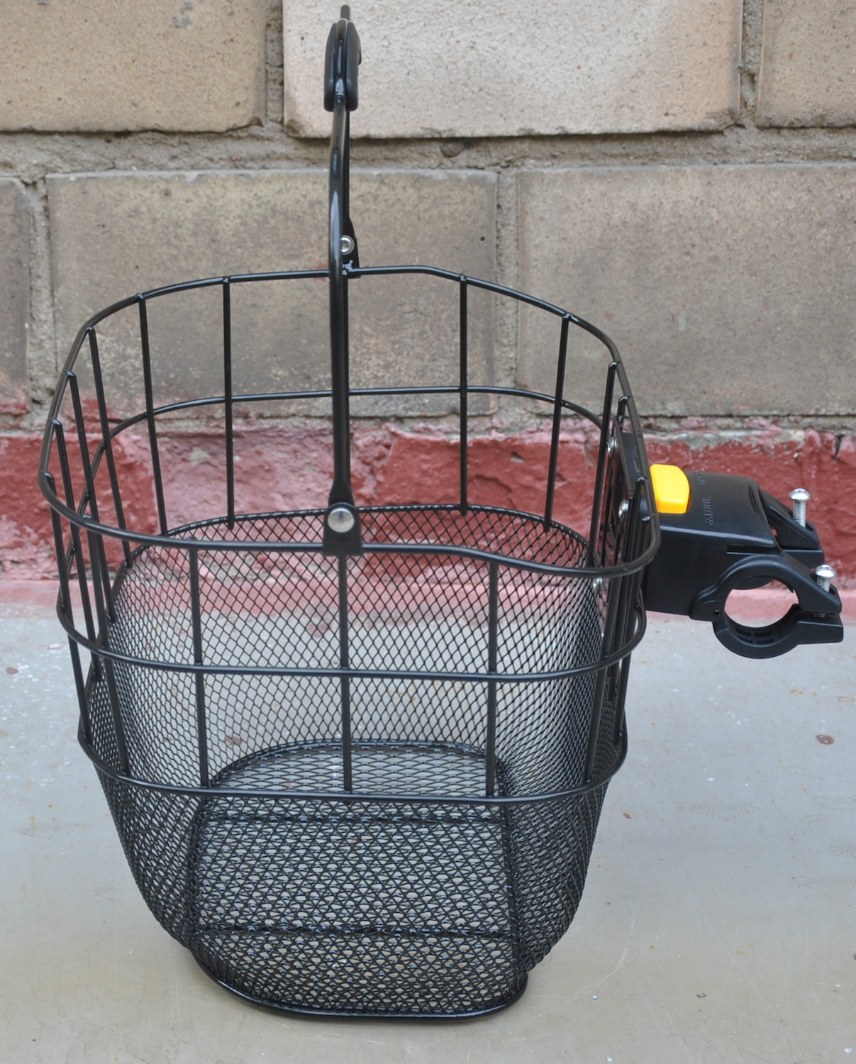 Корзина с механизмом фиксации на руле, быстросъемная, с ручкой, стальной пруток/сетка, усиленное дно, цвет черный, размер 35x26,5x25/23 см.