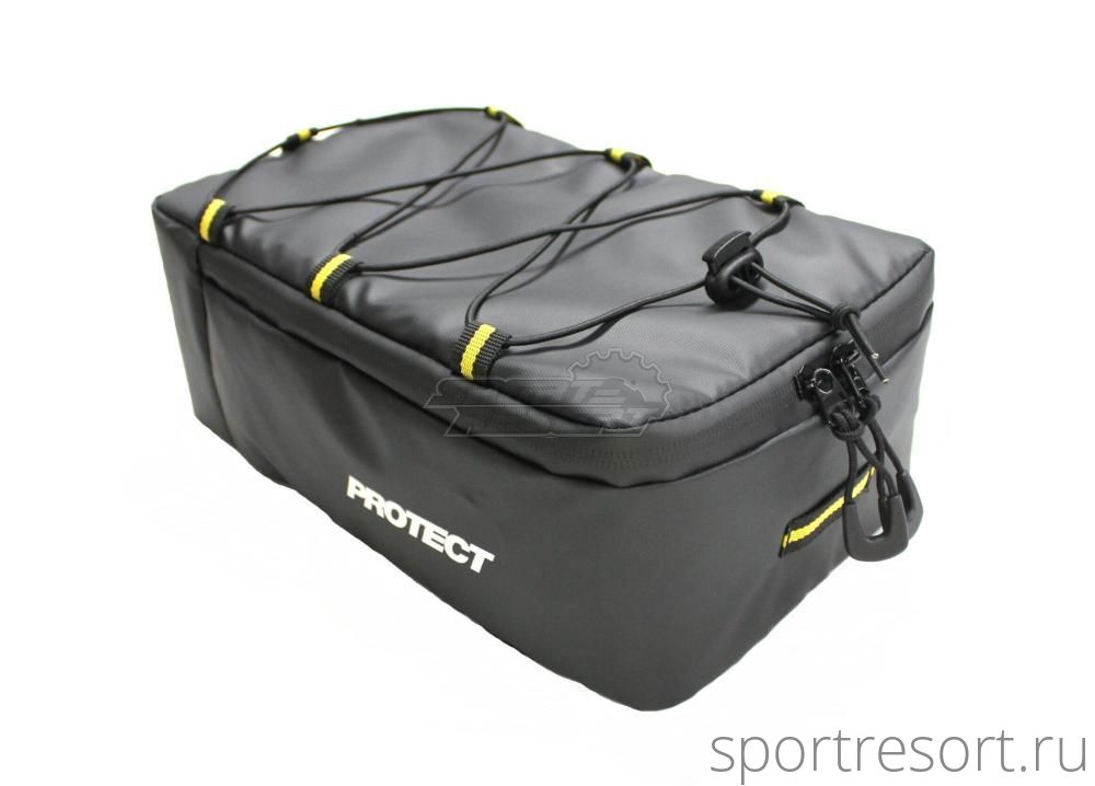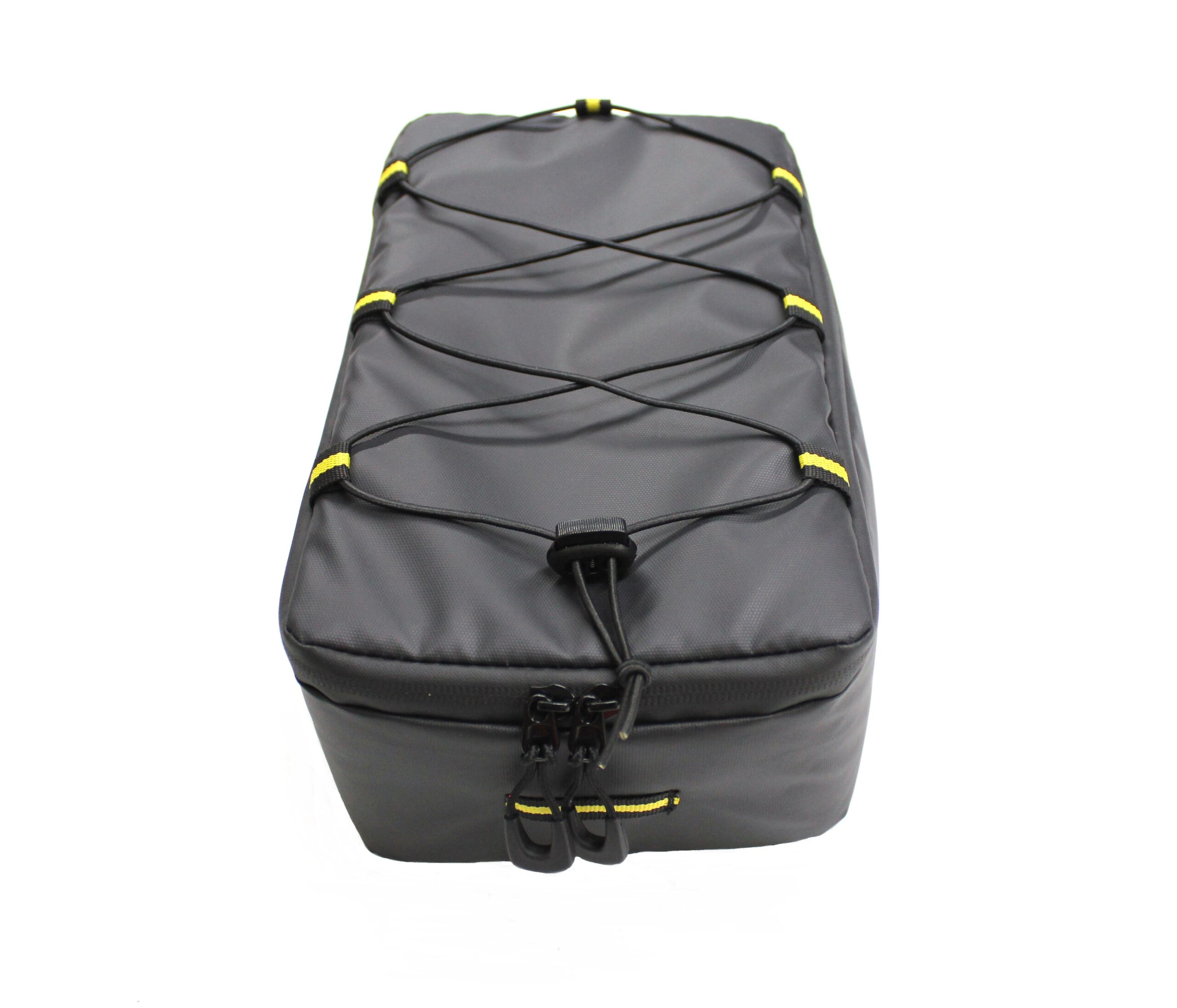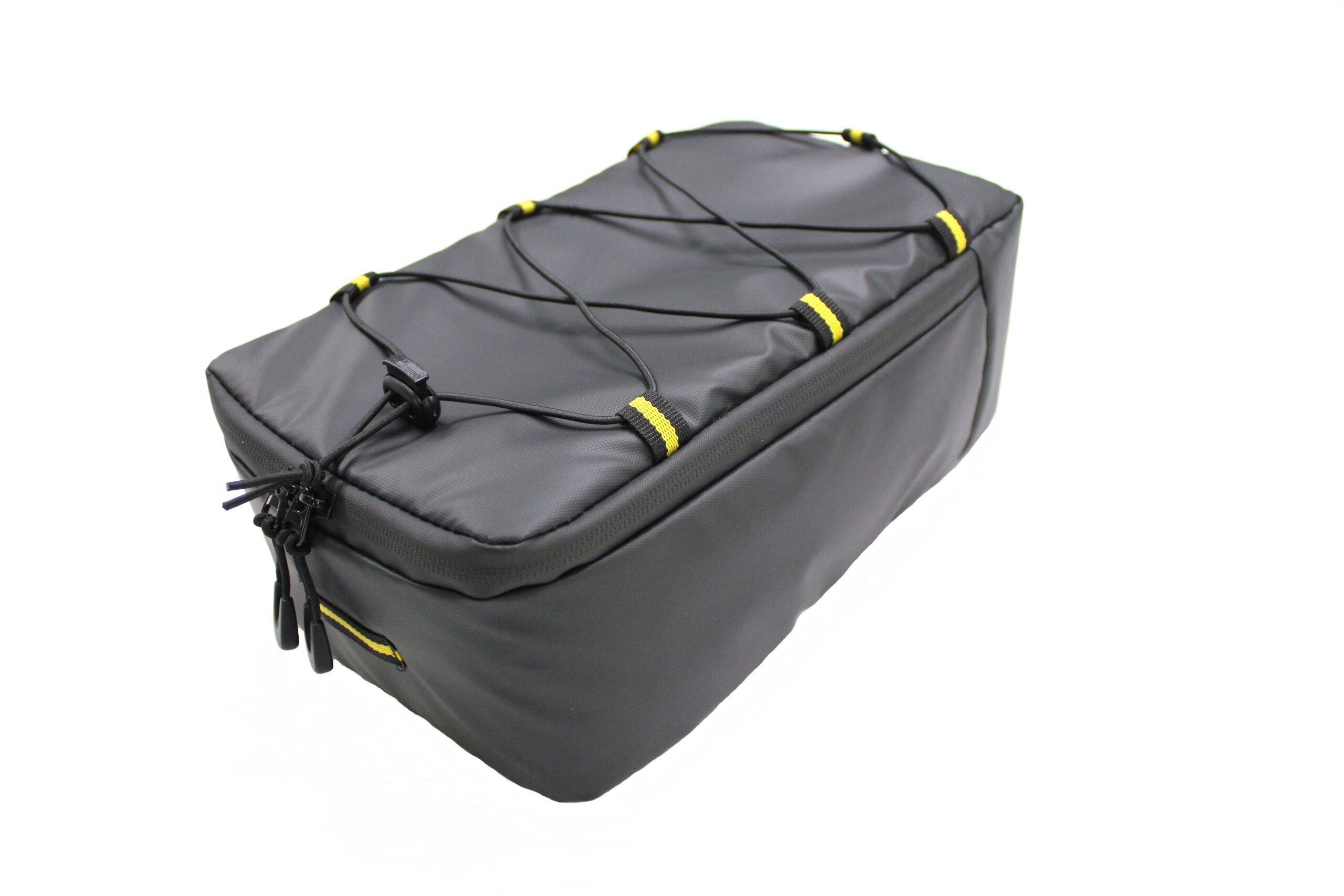 Велосумка на багажник — вместительная модель из качественного материала – ламинированный нейлон высокой плотности с водоотталкивающим покрытием. Основное отделение вместимость 5,9 литров, на крышке сумки стяжка из резинки для вспомогательного груза, с тыльных сторон находиться ручка переноска и крепление для фонаря.