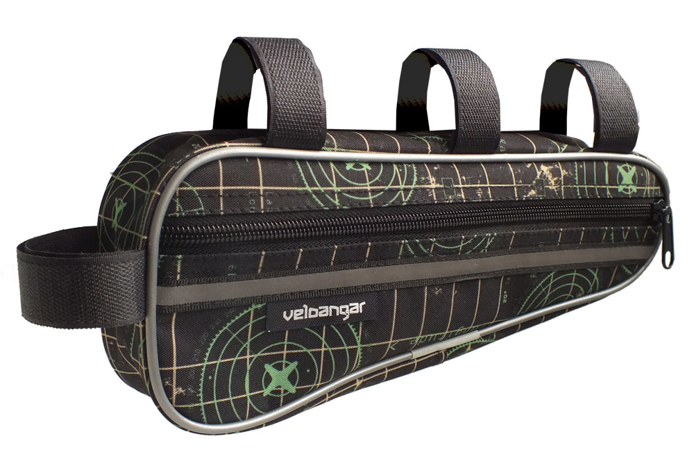 Узкая длинная подрамная велосумка для полезных вещей, инструментов, карт, насоса, запасных деталей и т.п.2 отделения - молнии с двух сторон.