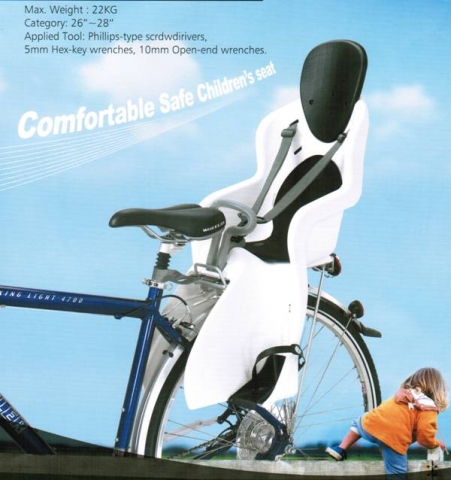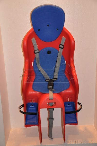 Детское велокресло GH-523, для установки назад, устанавливается на задний багажник путем сквозной фиксации, большой подголовник, трех точечный ремень безопасности, регулируемые по высоте подножки, мягкая подкладка, мягкая ручка, откосы безопасности для ног, для детей до 5 лет, максимальная нагрузка 22 кг, для велосипедов от 24 до 29 дюймов. Европейский сертификат ISO 11243.