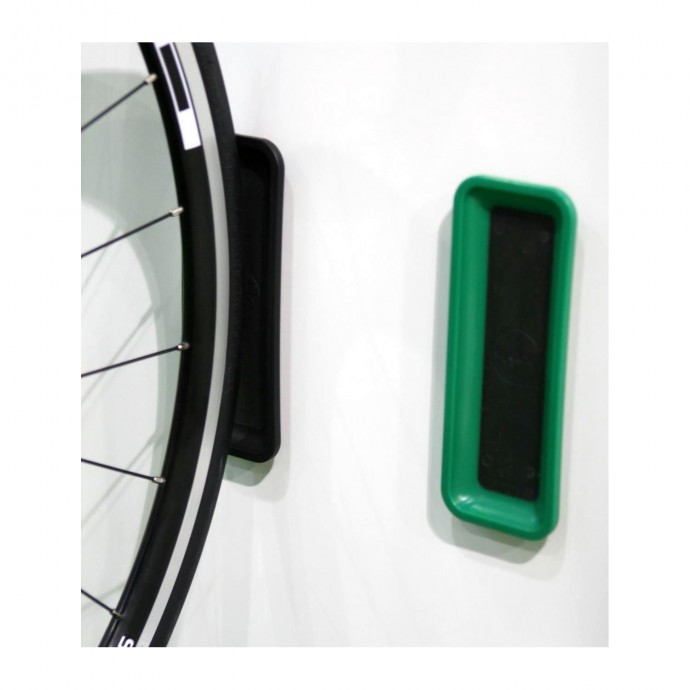 Складная конструкция позволяет убирать его в случае необходимости. Сделан из прочного пластика, усиленного внутри алюминиевыми пластинами. Сам крюк полностью обрезинен, что бы не поцарапать обод колеса. Наличие сквозного отверстия, позволяет пристегнуть велосипед велозамком типа U-Lock или тросом. В комплекте идет подставка для второго колеса, что бы не пачкать стену.