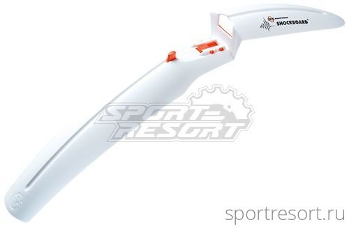 Крыло переднее SKS Shockboard, цвет белый, для велосипедов 26 дюймов, крепление в шток вилки (в комплекте переходники под разные размеры), быстросъемное крепление (нажатием кнопки), общая длина 60 см, ширина 8 см, вес 110 грамм.