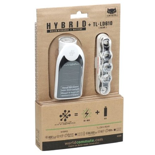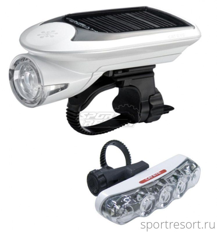 Комплект фонарей Cat Eye, гибридный передний фонарь с подзарядкой от солнца HL-EL020 + мощный задний фонарь TL-LD610, в белом цвете, с элементами питания. Фонарь Cat Eye HL-EL020 Hybrid, это инновационное устройство с двумя элементами питания и встроенной солнечной батареей для подзарядки. Интегрированная солнечная батарея заряжает аккумулятор NiMH и позволяет работать до 6 часов, вторая щелочная - резервная батарея, позволяет иметь резерв до 30 часов автономной работы, если например наступила ночь. Гибридная конструкция позволяет выбирать между источниками питания для обеспечения максимальной производительности и времени работы. В обоих схемах питания есть мигающий и постоянные режимы.| Размеры: | 100.0 x 48.0 x 44.9 мм |