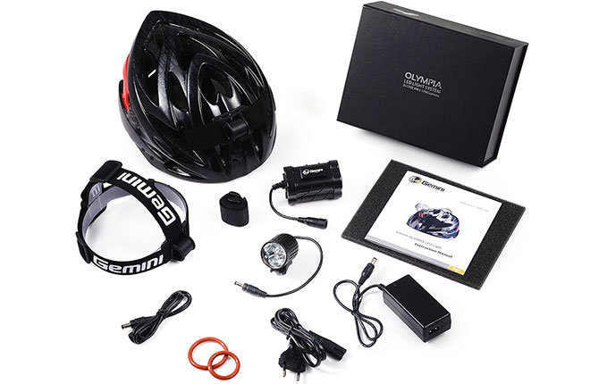 Мощная велофара Gemini Olympia Led Light System, мощность 1800 Lumen, 3 диода CREE XM-L U2 с защитой от перегрева, вес 78 грамма (только фара), 350 грамм (с 6-ю аккумуляторами), линза 19° Standard Optic, зарядное устройство + 6 аккумуляторов Samsung 7800 mAh (с защитой от переизбытка зарядки), 4 режима работы Low / Med / High / Flash, алюминиевый корпус фары и блока питания, универсальность: крепление на руль, шлем или на голову с помощью налобного ремня.Комплектация: