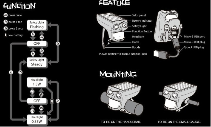 Велофара iLumenox Skully K2 Solar, мощность 1,5 W, 1 CREE светодиод (пр-во Япония), 3 режима работы, с солнечной батареей для подзарядки, индикатор слабой зарядки, встроенный аккумулятор, зарядка от USB.