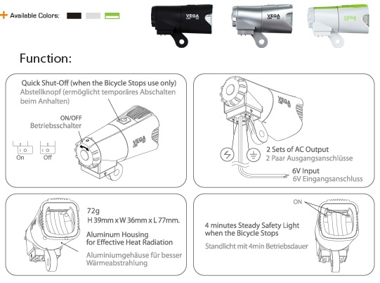 Фара передняя iLumenox VEGA 6V DYNAMO HEADLIGHT, для использования с динамо-генератором или динамо-втулкой, питание 6 вольт, мощность 35 люкс (10 метров), влагозащищенная, вес 72 грамма, цвет корпуса черный.Фара iLumenox VEGA 6V DYNAMO HEADLIGHT оснащена мощным диодом CREE и имеет систему отражения (наподобие автомобильной фары). Эффективность освещения, достигается на расстоянии до 10 метров, при этом мощность составляет 35 LUX. Передняя часть корпуса сделана из алюминия для лучшего отвода тепла, тем самым продлевается срок службы диодов. Электронная стабилизация поступающего тока для равномерного свечения. Если велосипед останавливается, например на светофоре, то свечение продолжается в течение 4 минут. Размер: H 39мм х 36мм х W L 77мм.