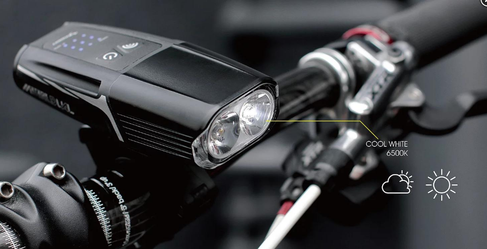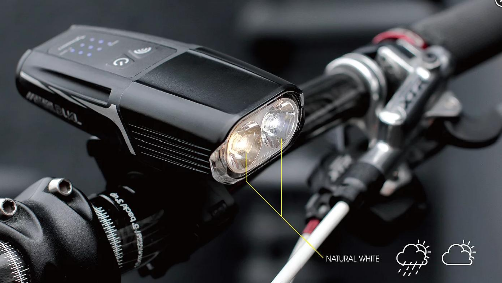 Велофара Moon Meteor Storm Dual, 2 мощный диода с разной цветовой температурой 3000К/6500К, возможность использовать как противотуманную фору, максимальная мощность 1300 люмен, алюминиевый корпус радиатора охлаждения, датчик защиты ото перегрева, 8 режимов работы: мощный, 3 стандартных режима (дневной, ночной и смешанный), 3 мигающих режима, режим SOS. Питание от 2-х аккумуляторов 18650 по 2200 мАч каждый. Универсальное быстросъемное крепление на руль (под диаметр 22-35 мм), а также крепление на шлем. Время полной зарядки 2.5 часа. Индикатор низкого заряда батареи, и полной зарядки. Умная система блокировки. Порт для зарядки USB-C (тип кабеля USB-C). Водонепроницаемый корпус (IPX 5). Размер 115,7 х 48,5 х 31 мм. Вес 200 грамм.Комплектация:
