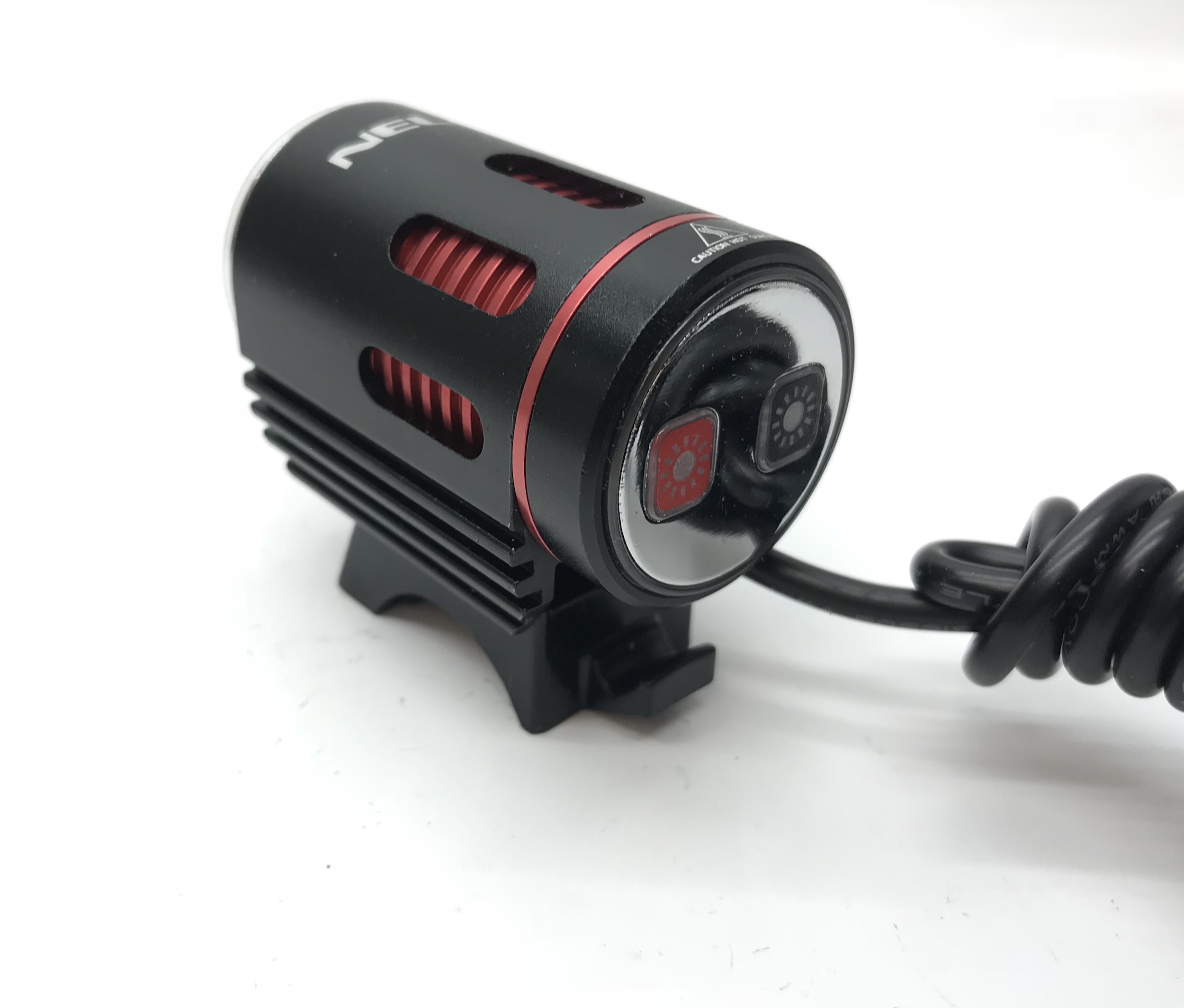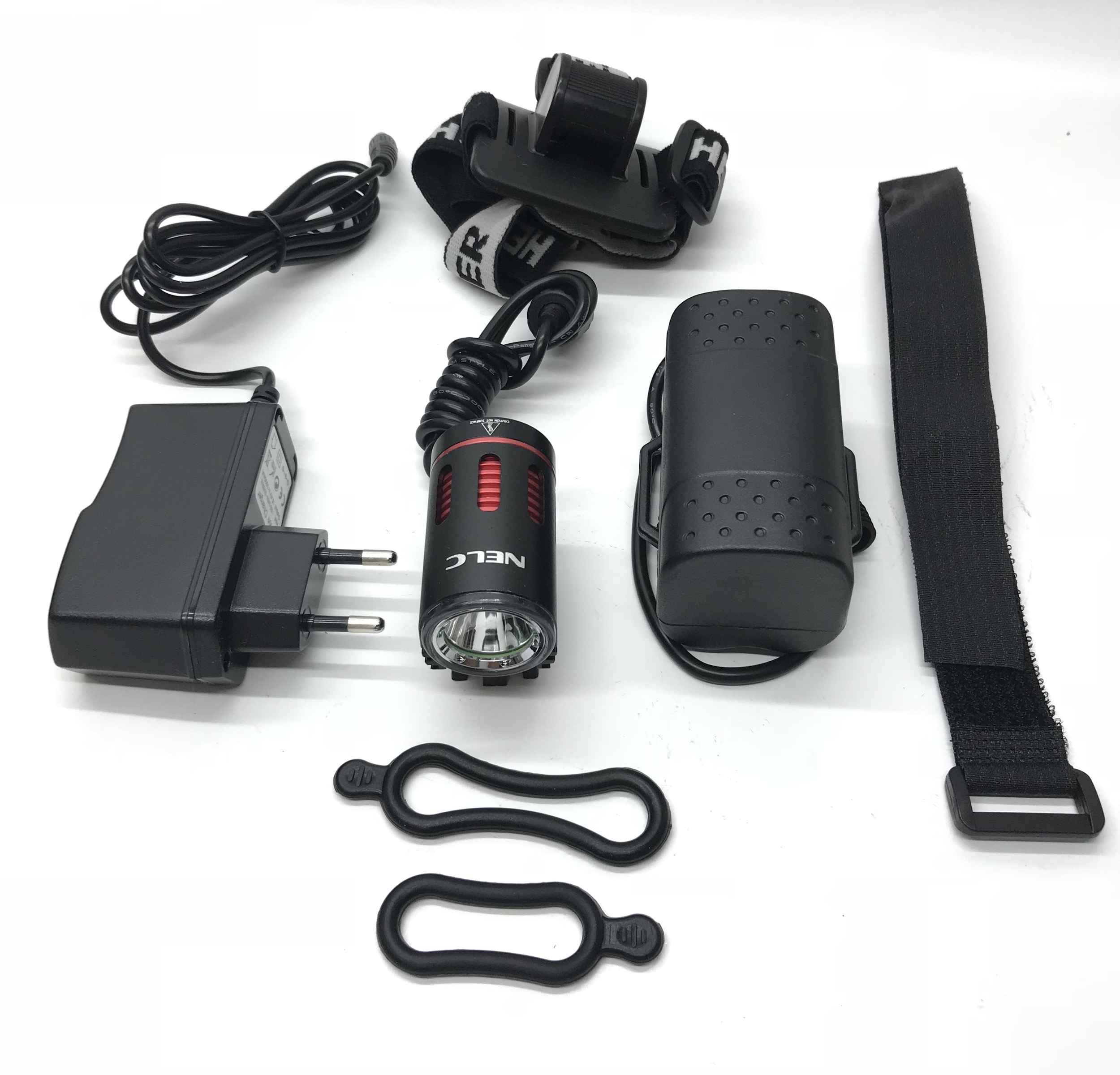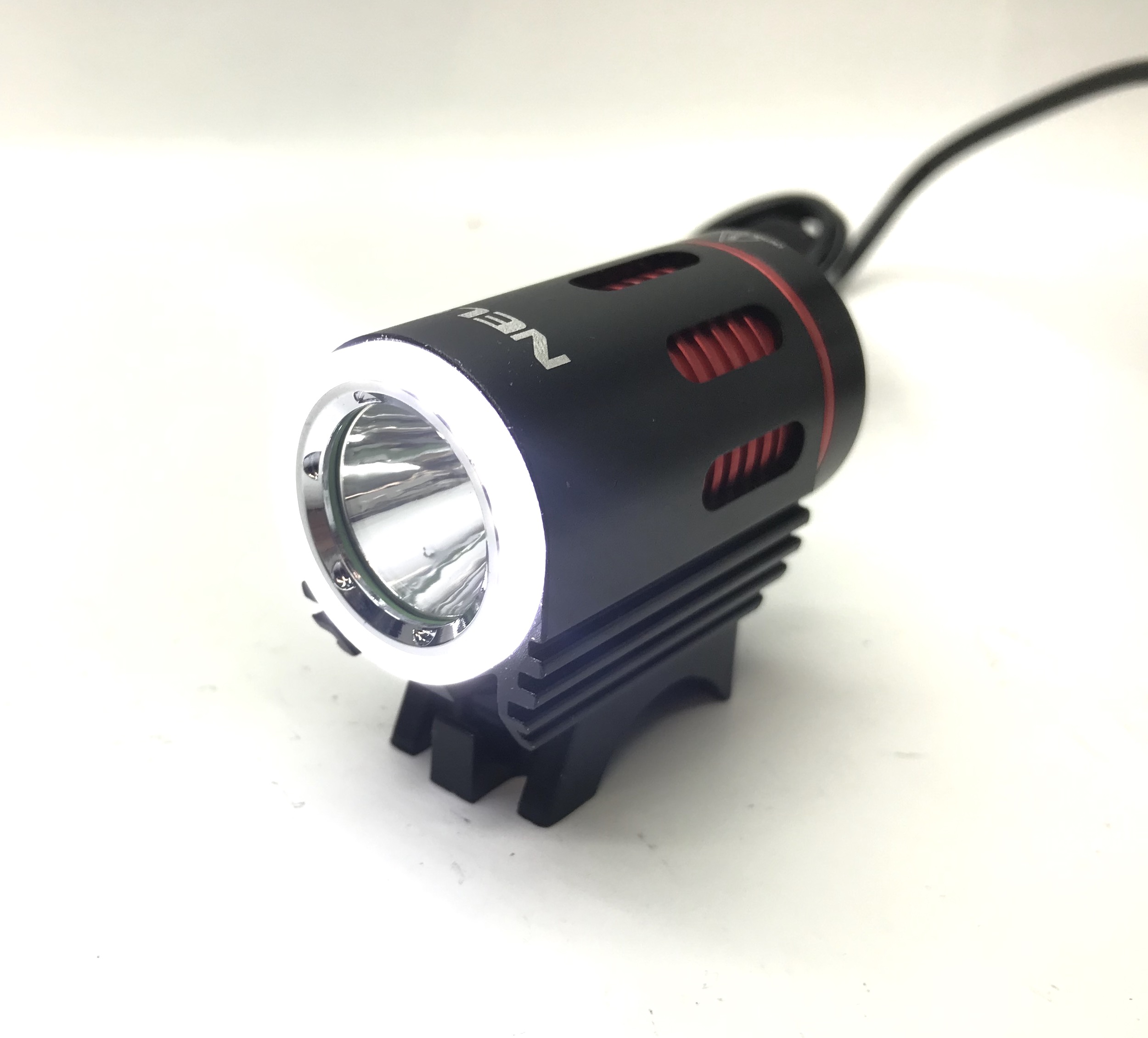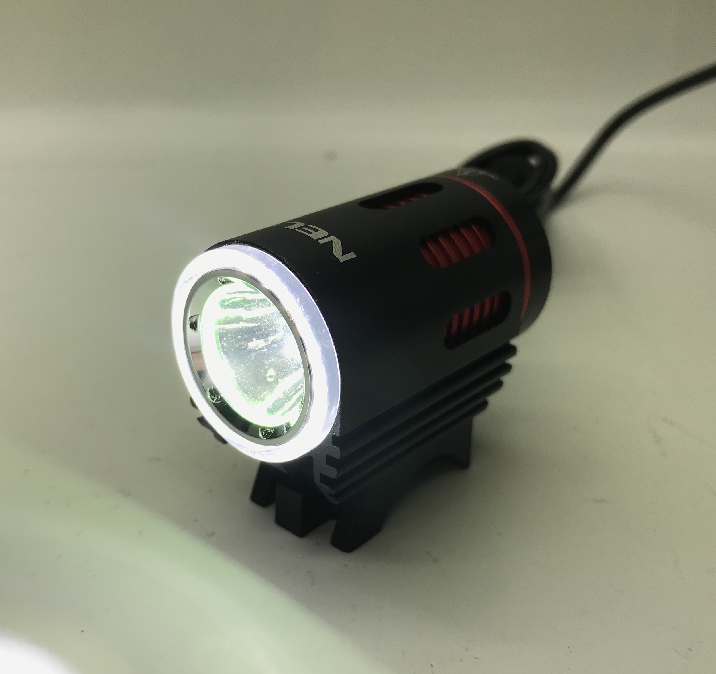 Велосипедная фара NELC 31G, алюминиевый корпус Ø30мм, диод Cree XM-L2 T6, максимальная мощность 1000 люмен, окантовка фары с подсветкой "ангельские глазки", крепёж на руль и голову, аккумулятор 6000мАч 8.4v в герметичном корпусе, зарядка 220 вольт.