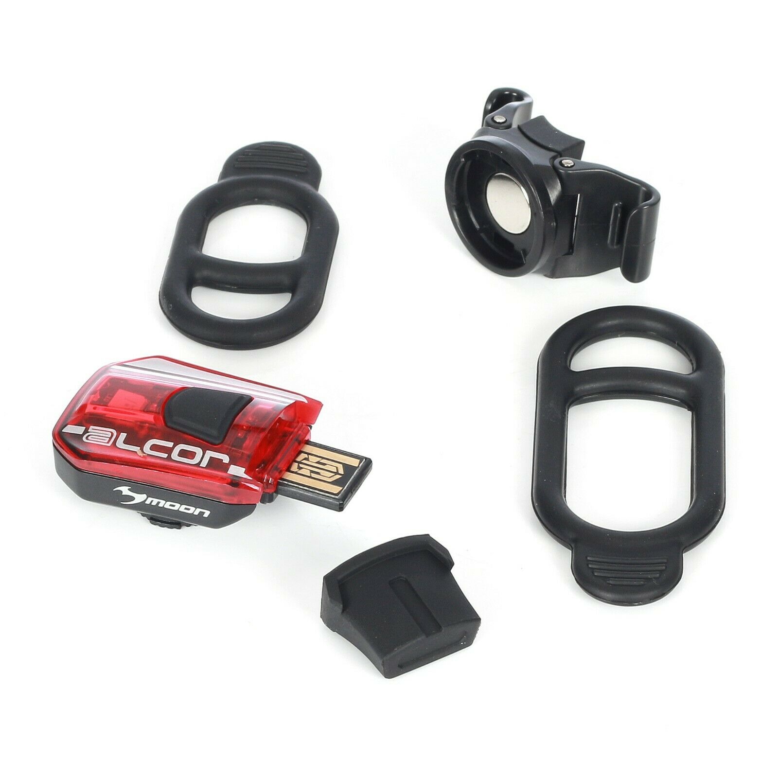Задний велосипедный фонарь Moon Alcor, максимальная мощность 15 люмен, угол свечения 119 градусов, влагозащищенный корпус IPX4, встроенный аккумулятор с зарядкой от USB (встроенный порт), функция AUTO SAFE MODE, функция памяти последнего режима, универсальное магнитное крепление, совместимость с аэро штырями, вес 17 грамм.Режимы работы: