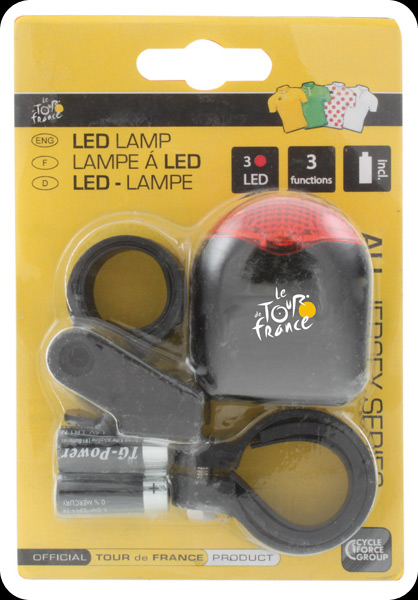 Велофонарь задний CFG Rear Led Lamp, серия официальных аксессуаров Tour De france, 3 светодиода, 3 режима работы, универсальный хомут на рули 22-31.8 мм, батарейки UM5 (R1) в комплекте.