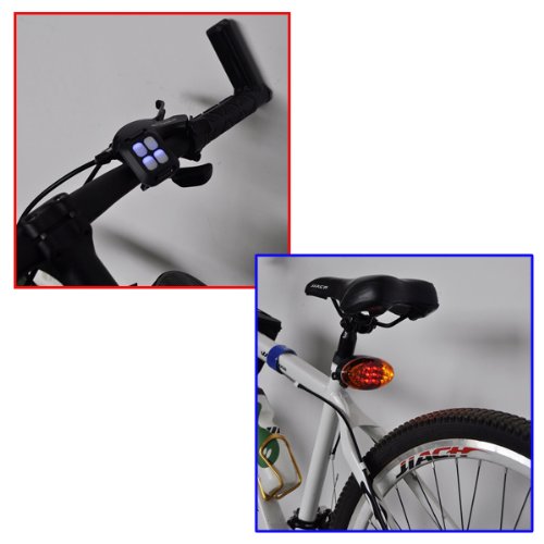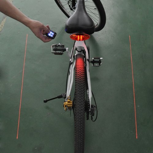 Велофонарь задний Lazer Tail Light 3 в 1, 5 диодов, 6 режимов, габарит, стоп сигнал, поворотники, лазерные проекторы на асфальт вдоль велосипеда (длина линий 650 мм, дистанционный пульт управления на руль, питание фонаря 2 х ААА, питание пульта CR2032.