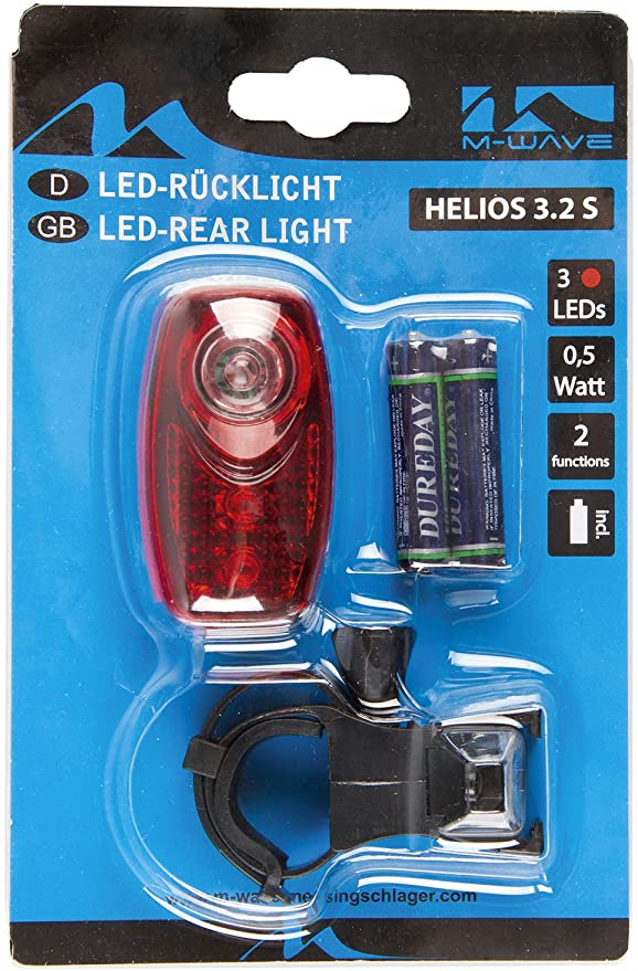 Задний велосипедный фонарь M-Wave HELIOS 3.2S, 3 ярких светодиода, режим Superflash, 2 функции, универсальное крепление за подседельный штырь с возможностью поворота фонаря по оси, батарейки в комплекте.