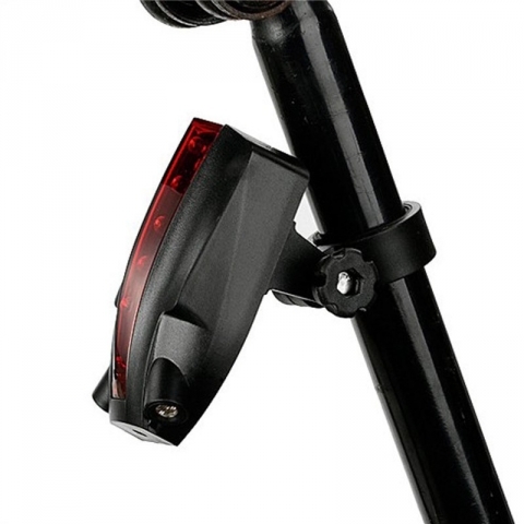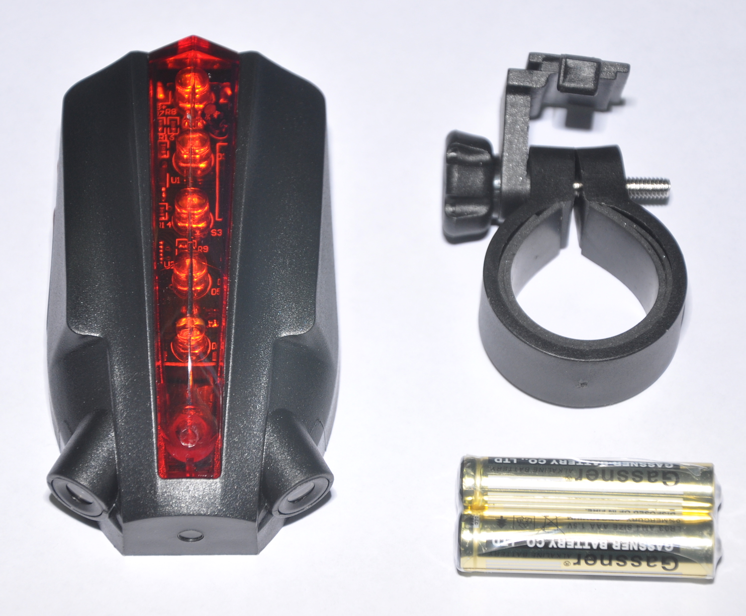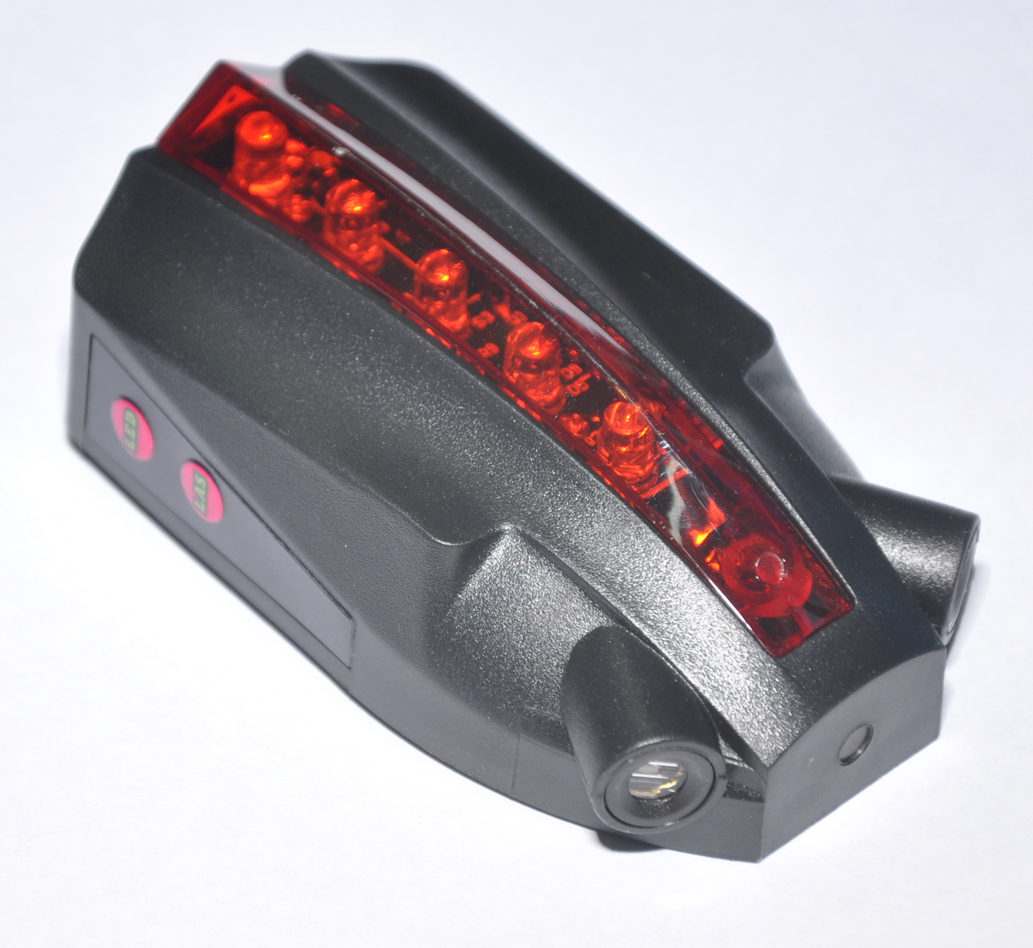 Фонарь с лазерными полосами задний NanoLed Lazer Tail Light PRO-L09, 5 красных светодиодов, 2 отдельные кнопки, 2 батарейки ААА, 5 режимов мигания, 2 режима лазерных линий + проекция велосипедиста, универсальное крепление, размер 50х86х30 мм, вес 75 грамм.Две лазерные параллельные линии по обе стороны велосипеда. Способность работы фонаря в трех режимах: лазерные линии, проекция велосипеда, габаритный фонарь. Компактный и стильный дизайн с удобным переключением режимов. Влагозащищенный корпус. Время работы до 30 часов.