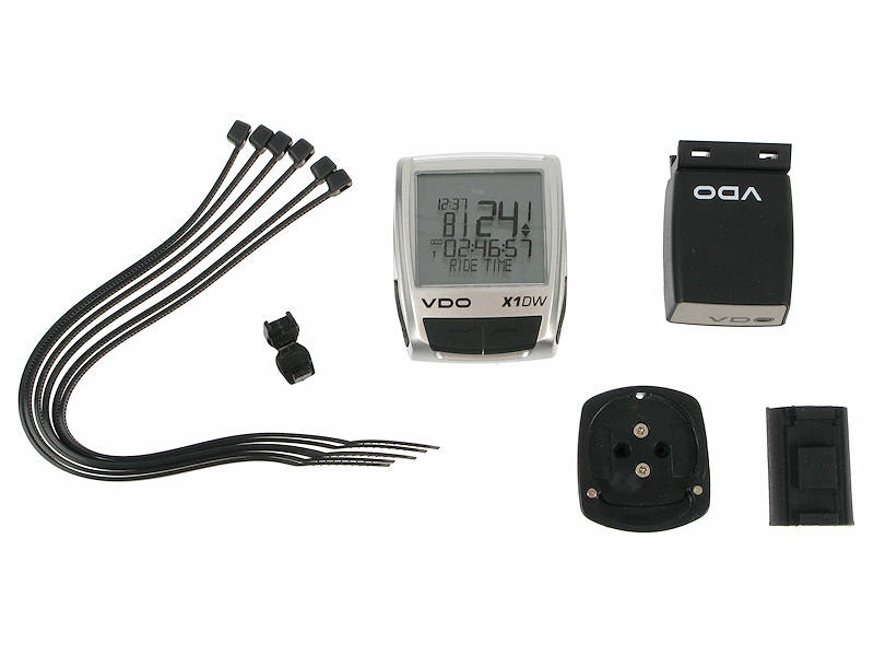 Велокомпьютер VDO X1-DW беспроводной, имеет 11 функций, беспроводной, цифровая передача данных, влагозащищённый корпус, серебристо-черного цветаОсновные функции/возможности: