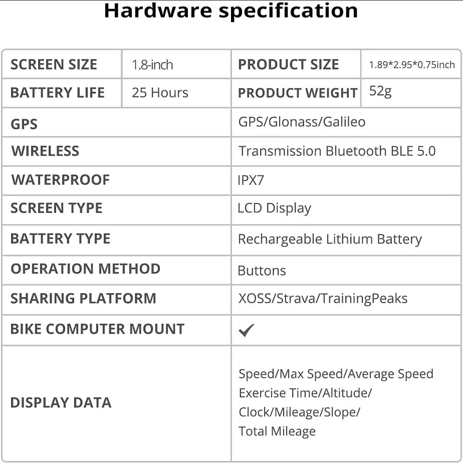 Профессиональный велокомпьютер XOSS G GPS. Встроенный литиевый аккумулятор 500 mAh, размеры 48х75х19 мм, вес 52 грамма. Рабочий диапазон -10/+50 градусов. Время работы от одной зарядки до 25 часов. Влагозащита IPX7. Поддержка мобильных приложений и STRAVA, BLE 5.0.