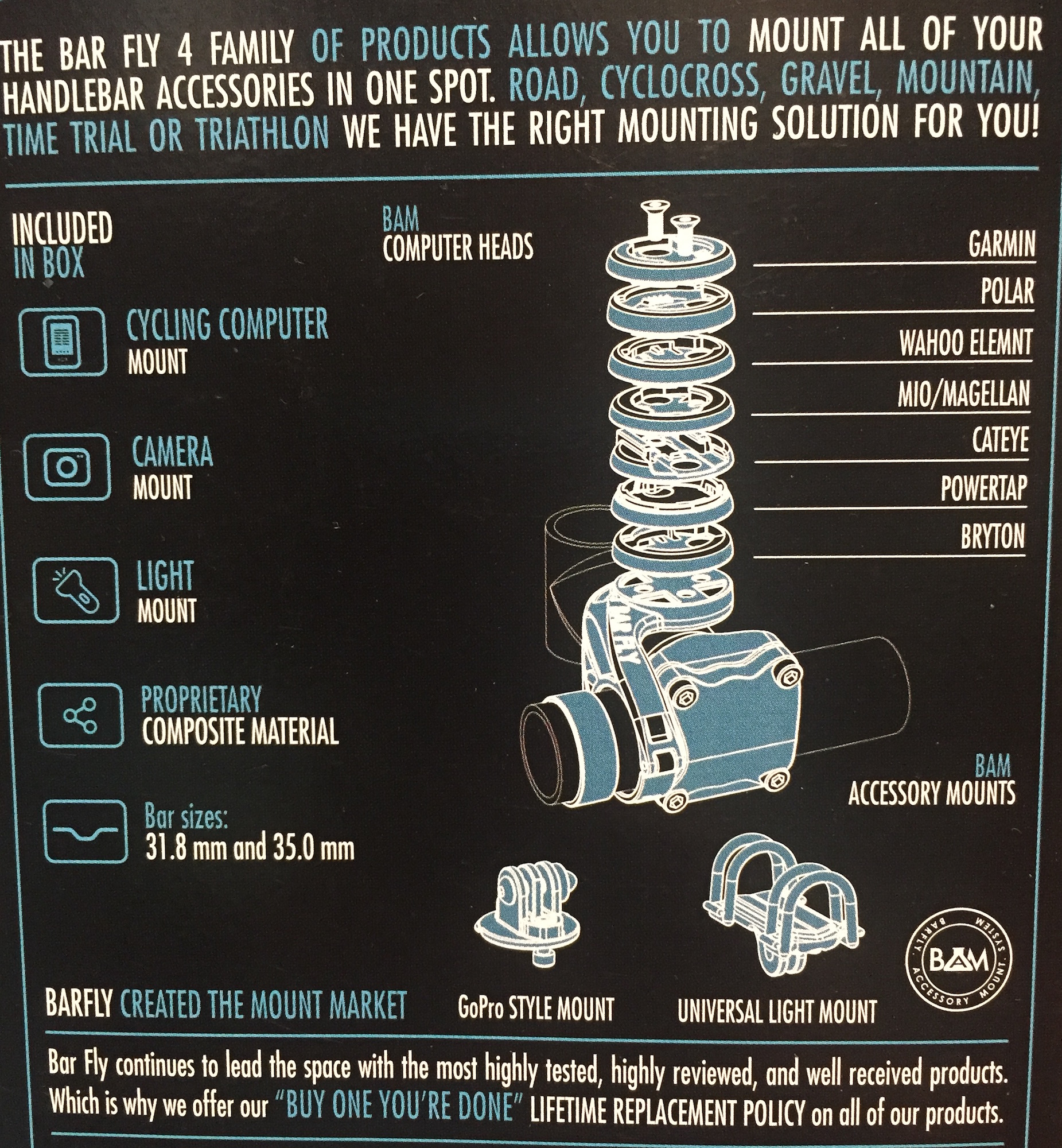 Крепеж Bar Fly 4 MTB разработан специально для MTB, CX, учитываю специфику и требования этих направлений. Надежное крепление компьютера, камеры или фонаря, варианты настройки. Комплект включает в себя адаптеры для установки велокомпьютеров Garmin, Polar, Wahoo, Mio, Magellan, Cateye, Powertap, Bryton, камер GoPro и различных фонарей. Совместим с рулями 31.8 и 35.0 мм.Комплектация: