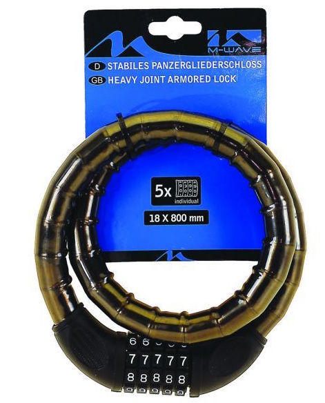 Замок велосипедный M-Wave, длина 800 мм, толщина 18 мм, механизм кодовый, усиленная конструкция (стальной трос + металлические звенья).