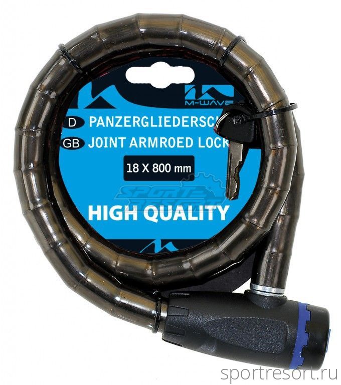 Замок для охраны велосипеда M-Wave, длина 800 мм, толщина 18 мм, механизм с ключом, усиленная конструкция (стальной трос + сегментные стальные звенья).