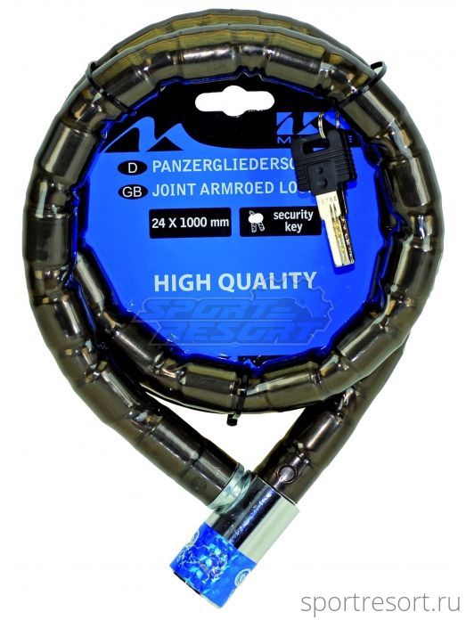 Противоугонный замок M-Wave, для вело и мото техники, стальной трос опрессованный стальными звеньями, длина 1000 мм, толщина 24 мм (степень защиты 9), механизм с ключом, антивандальная конструкция замка, в комплекте 2 ключа.