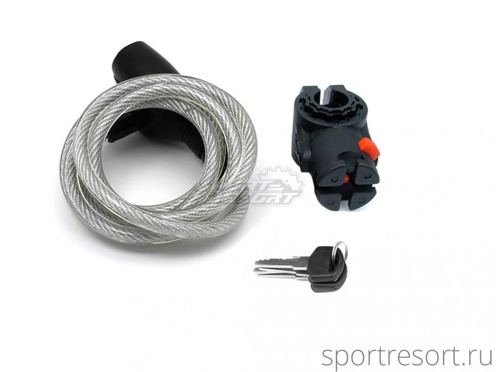 Замок велосипедный, трос 8х1500мм, механизм на ключе. В комплекте крепёж для транспортировки на раме велосипеда. Цвет серебристый
