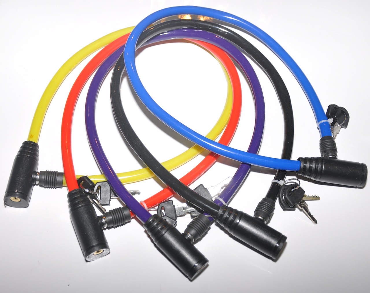Замок противоугонный для велосипеда, стальной трос в ПВХ оболочке, длина 600 мм, толщина 12 мм, механизм с ключом, разных цветов.