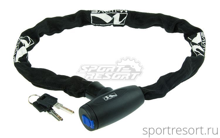 Цепной велозамок M-Wave, стальные звенья в матерчатом чехле, толщина звена 6 мм, длина замка 850 мм, механизм на ключе, в комплекте 2 ключа.