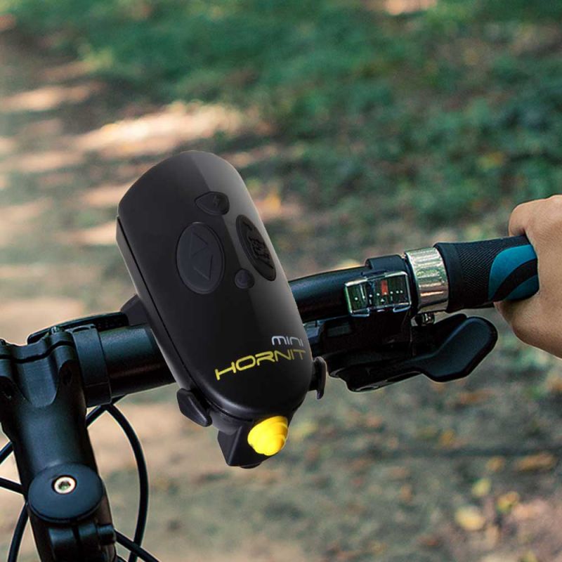 Сигнал электрический HORNIT Mini, 25 различных звучаний, выносная кнопка управления, влагозащита IP33, компактные размеры, питание 2хААА. Встроенный габаритный фонарь (12 люмен), 4 режима, 2 цвета: белый и зеленый. Установка на любые рули велосипедов, скутеров, самокатов.