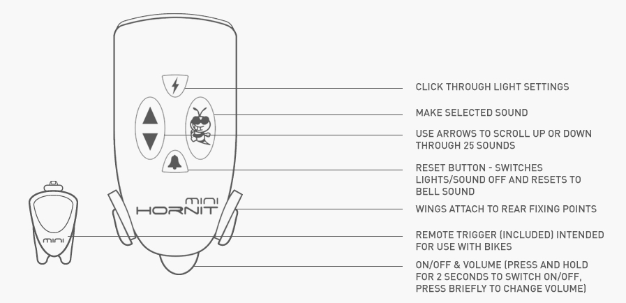 Сигнал электрический HORNIT Mini, 25 различных звучаний, выносная кнопка управления, влагозащита IP33, компактные размеры, питание 2хААА. Встроенный габаритный фонарь (12 люмен), 4 режима, 2 цвета: белый и зеленый. Установка на любые рули велосипедов, скутеров, самокатов.