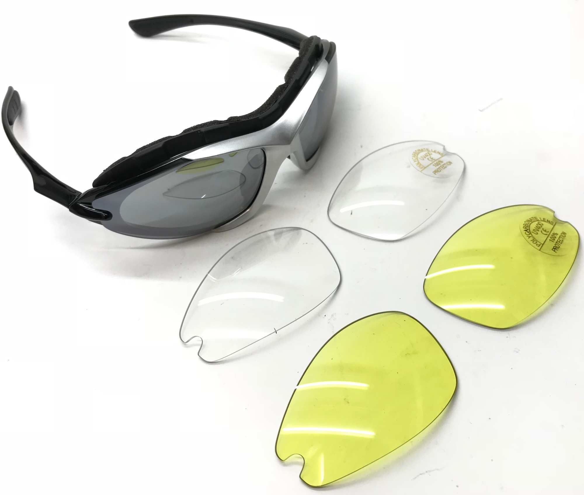 Очки велосипедные KINDAVID S11578. Цвет оправы - серебро/черный. Линзы - поликарбонат, UV-защита. Три сменные линзы в комплекте: дымчатый, жёлтый, прозрачный. Поролоновый уплотнитель с вентиляцией в верхней части оправы, силиконовая переносица, силиконовые вставки.