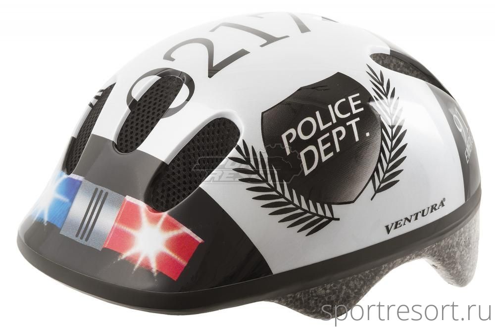 Велосипедный шлем Ventura Police для детей, размер 52-56 см (регулируется по голове), ремешковое крепление, мягкие вставки, вентиляционные отверстия закрытые сеточкой изнутри.