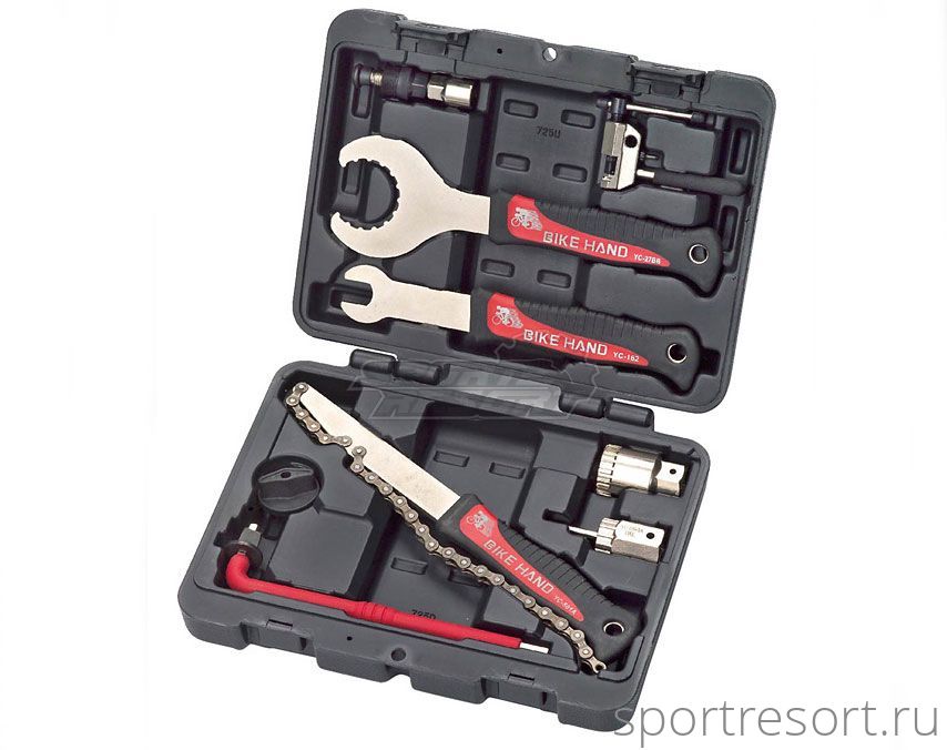 Набор инструментов в чемодане Bikehand YC-725 включает в себя: съемник шатунов YC-215CB, выжимка цепи YC-325-P2, съемник гайки шатунов Hollowtech2 2 YC-27BB, педальный ключ YC-162, съемник-хлыст для кассеты YC-501A, съемник шатунов Hollowtech2 YC-27, съемник каретки (isis/квадрат/окталинк) YC-26BB-1A, съемник кассеты YC-126-1A, ключ Г-образный 8 мм YC-812LE с накидной головкой под ключи.Идеальный вариант для тех, кто меняет систему старого стандарта типа квадрат, окталинк, ISIS на систему современного стандарта Hollowtech 2 (каретка с внешними чашками).