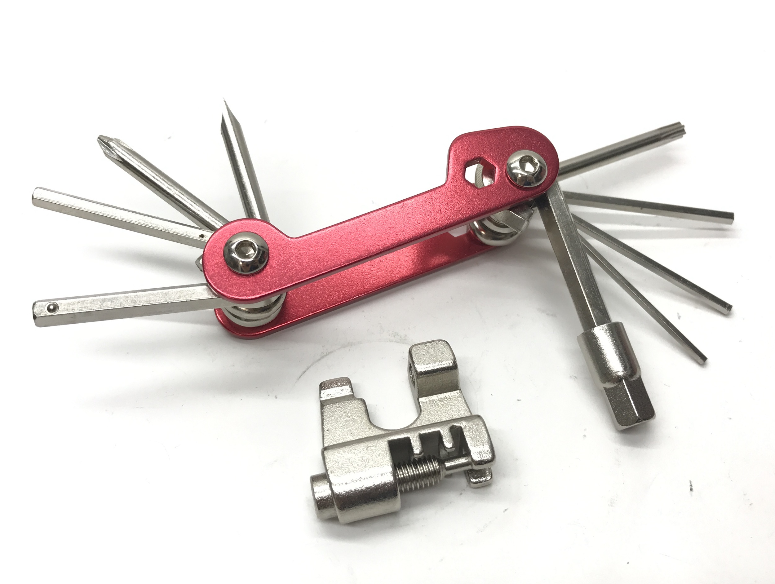 Ключи в ноже, 10 позиций. Шестигранники 2/3/4/5/6/8мм + 2 отвертки + ключ Torx T25 + выжимка цепи.
