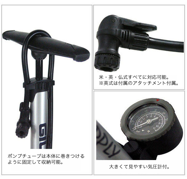 Насос напольный Giyo GF-31P, высота 60 см, алюминиевый корпус, манометр в Bar и Psi, шланг 70 см, авто и вело вентиль, максимальное давление 160 PSI.