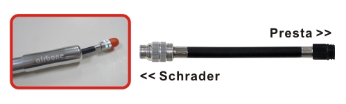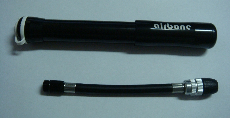 Насос Airbone ZT-509, алюминиевый корпус, компактный, длина 20 см, диаметр 27 мм, с резиновым шлангом, длина 15 см, ход поршня 12 см, конструкция по типу советских насосов, шланг утоплен в корпус насоса, при необходимости ввинчивается с обратной стороны, максимальное давление 100psi (7атм), автоматический клапан под ниппель А/V, F/V, вес около 120 грамм, крепление на раму.
