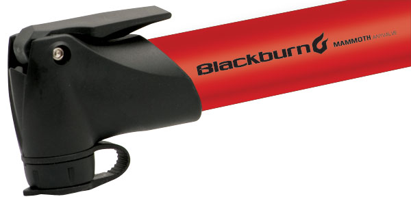 Насос Blackburn Mammoth AnyValve, алюминиевый корпус, Т-образная ручка, головка под любые ниппели (переходник авто-вело в комплекте), максимальное давление 90 PSI/6 BAR, крепление на раму, цвет красный.
