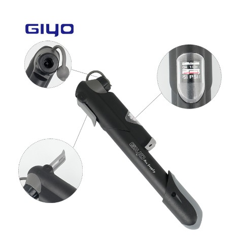 Велосипедный насос Giyo GP-61S Mini Pump, с манометром, компактный размер, длина 21 см, алюминиевый корпус, телескопическая конструкция, максимальное давление 7 атм/100psi, клапан реверсивный “авто/вело”.