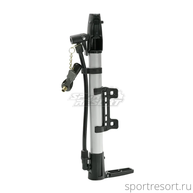 Насос пластиковый, с ножным упором, максимальное давление 100PSI/7 bar, диаметр 27мм, длина 330мм, универсальная головка на гибком шланге 20см, цвет серебристый.