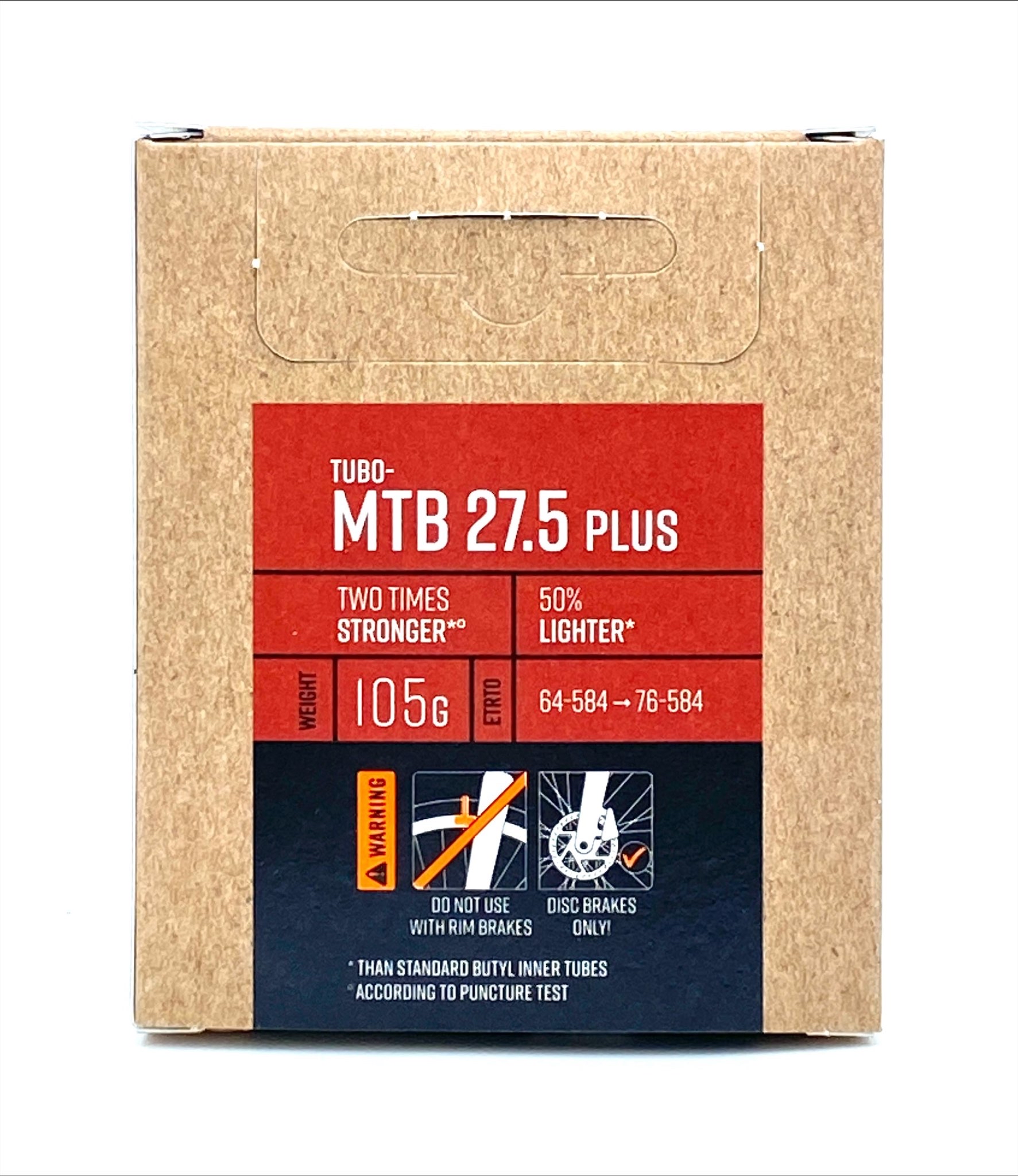 Велокамера Tubo MTB 27.5 Plus, вес 105 грамм, для горного велосипеда с максимально возможной защитой от проколов. Подходит для использования с колесами 27.5 и шириной резины 2.5"-3.0". Велосипедный ниппель 42 мм. Материал: инновационный материал ТПУ (термопластик полиуритан эластамер).Подходит для использования только с дисковыми тормозами.