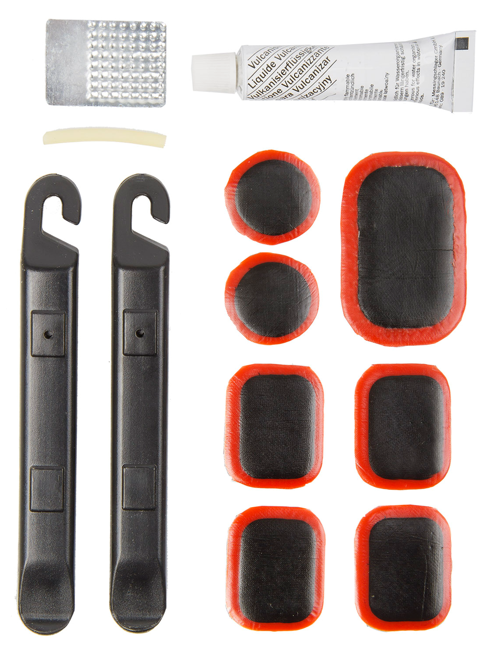 Велоаптечка M-Wave Tube Patch Kit, для ремонта велокамер в дорожных условиях. Состав: 2 нейлоновых монтажки, 2 круглые заплатки 26 мм, 4 заплатки 25х34 мм, 1 заплатка 34х51 мм, зачистка и клей 10 мл.