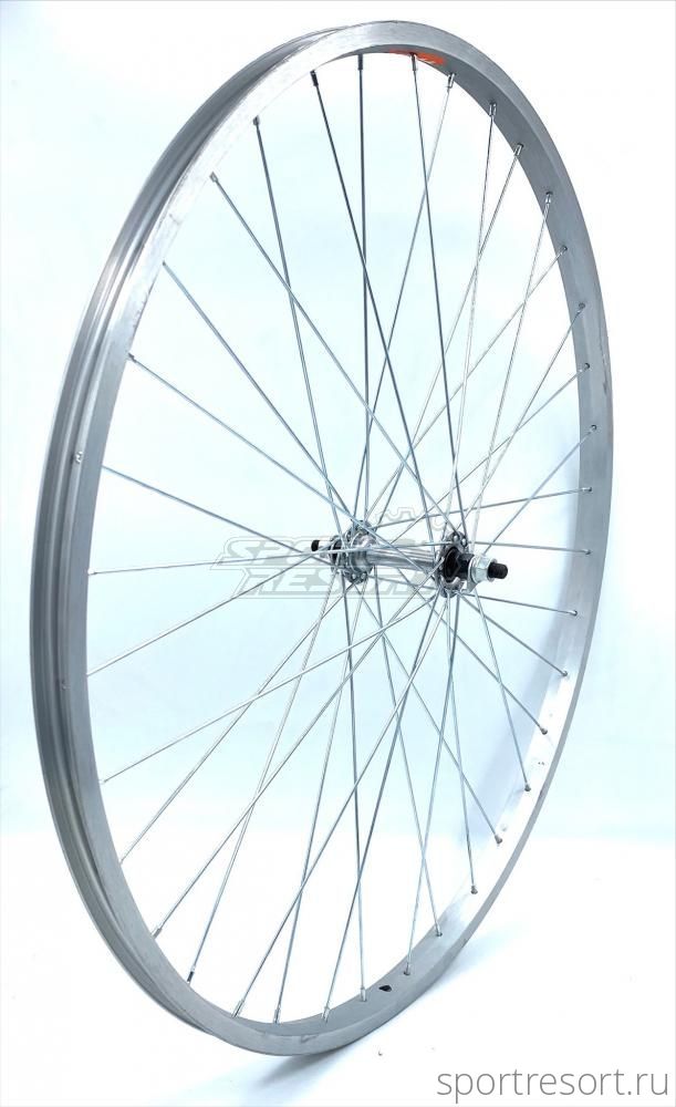 Колесо переднее 28 дюймов, одинарный алюминиевый обод 19 мм на 36 спиц, втулка на насыпных подшипниках. Крепление гайками.Характеристики