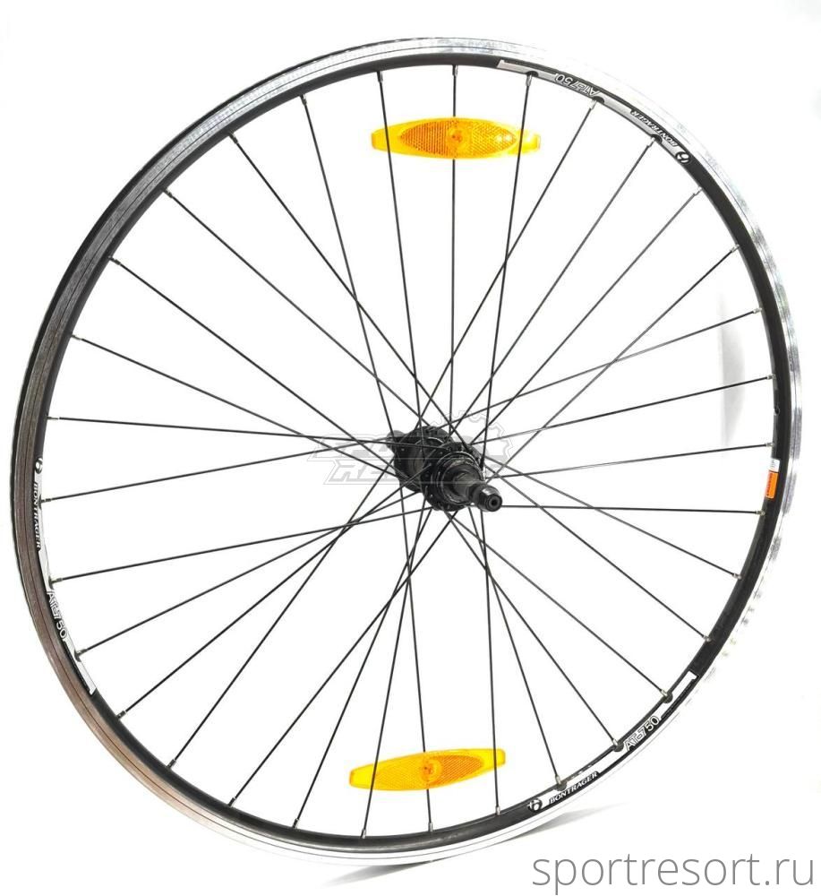 Заднее велосипедное колесо Bontrager, размером 28 дюймов (700С), алюминиевый двойной обод 622x17 мм (внутри 17 мм), под тормоз V-Brake, втулка  на насыпных подшипниках под трещотку, крепление под эксцентрик.